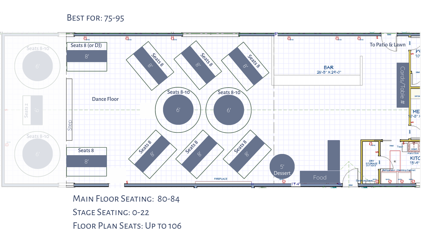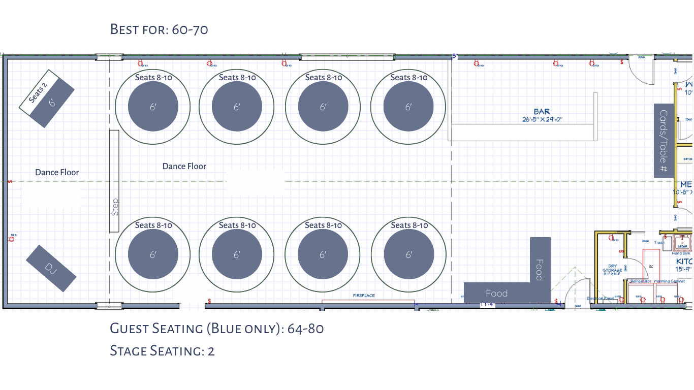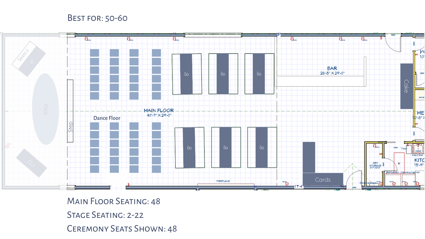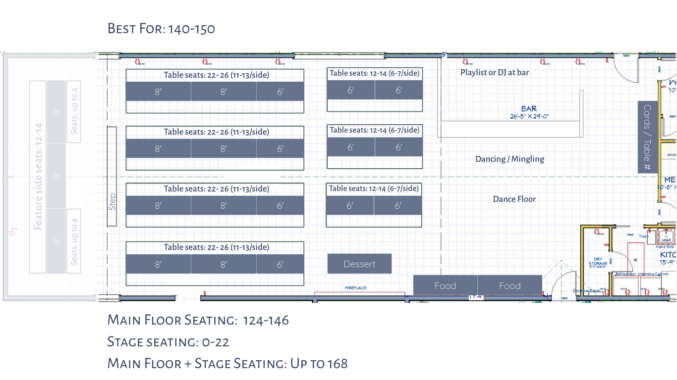 We can fit 3 rows of 72”-round tables and 4 rows of rectangular tables on both the main floor and the stage.