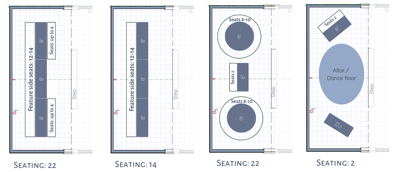 With these set-ups, the tables can be pushed back against the wall and the altar placed in front. Once the ceremony is over, the altar is moved to the side and the tables are brought forward.